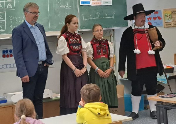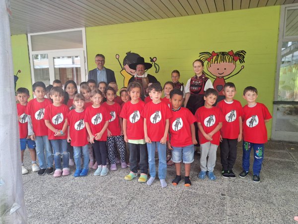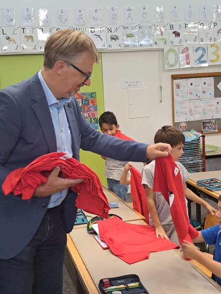 Unsere Erstklässler bekommen von der Stadt ein Chilbi T-shirt geschenkt. Dieses Jahr wurden sie von unserem Oberbürgermeister Martin Gruner überreicht.